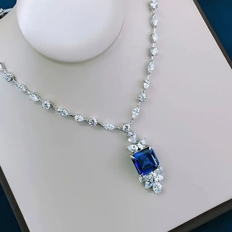 الوصف: عقد قطرة ياقوت أزرق ساحر ومغري، ينبعث منه الأناقة والجاذبية بتصميمه الرائع على شكل V وحجارته الكريمة الفاخرة.